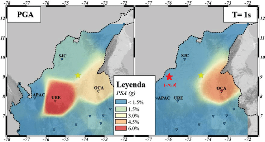 Nuestra edificación tiene un periodo fundamental de T1 = 1.0 s y está ubicada en 76°W 9°N, usamos el mapa de aceleración espectral mostrado en la Figura 4 y en la ubicación marcada (-76, 9) obteniendo un valor de aceleración espectral Sa ≈ 1.15 g.