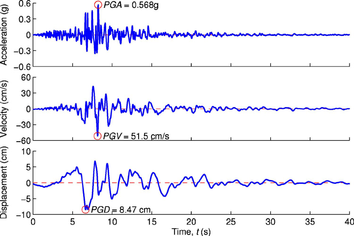 - PGD (desplazamiento pico): Resulta relevante en terremotos con grandes deformaciones permanentes, como aquellos en zonas de subducción o eventos con «fling step». Es especialmente útil para estructuras sensibles a desplazamientos de largo período.