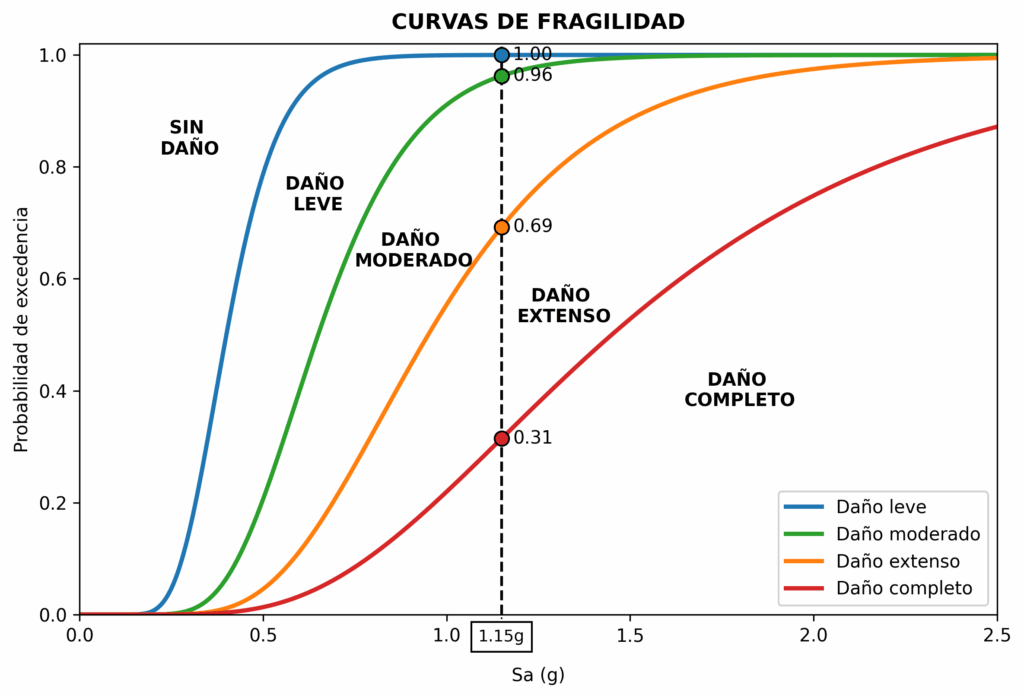 Para un sismo cuya Sa(T₁) alcance 1.15 g en el sitio, el edificio casi con certeza presentará daño leve/moderado, con ~69% de probabilidad de daño extenso y ~31% de colapso.