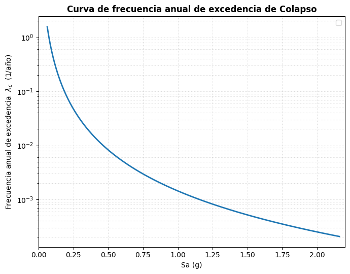 Para el sitio y el período del edificio (T₁ = 1.0 s), construimos la Frecuencia Anual de Excedencia obteniendo los valores de Sa(T₁,5%) en mapas de amenaza sísmica para distintos horizontes típicos (p. ej., 10% en 50 años, 2% en 50 años). Cada probabilidad de la curva de Fragilidad de Colapso se convirtió en Tasa Anual con el supuesto de Poisson y ajustaremos una función simple usando la ley de potencias.