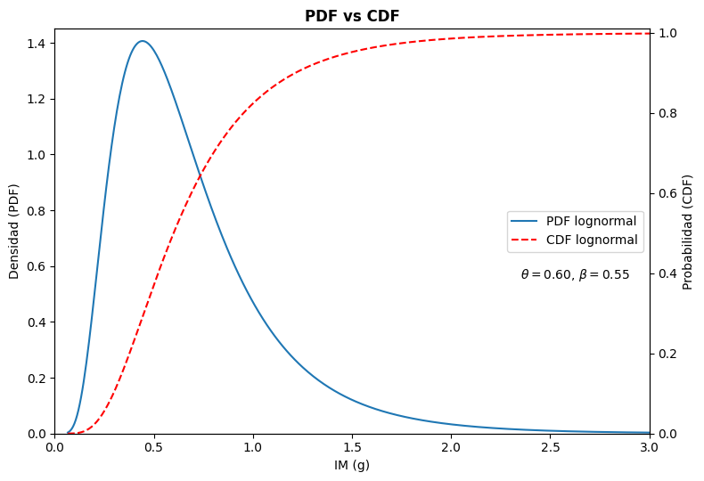 La función de densidad de probabilidad (PDF) indica dónde (en qué intervalo de IM) la probabilidad crece más rápido. Es útil para entender sensibilidad: te revela en qué rango de Medida de Intensidad conviene enfocar medidas de mitigación, calibración de registros o verificación adicional.