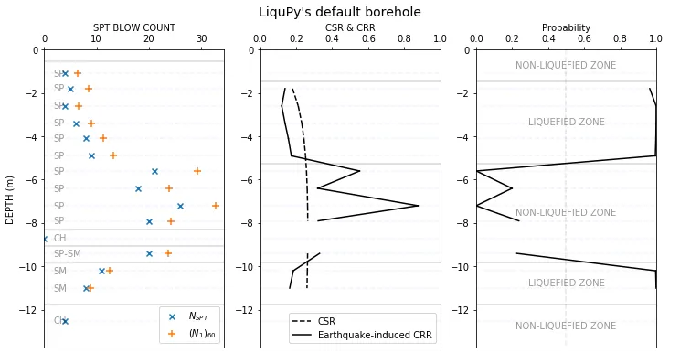 - Análisis de licuación basado en registros geotécnicos (borehole/CPT).